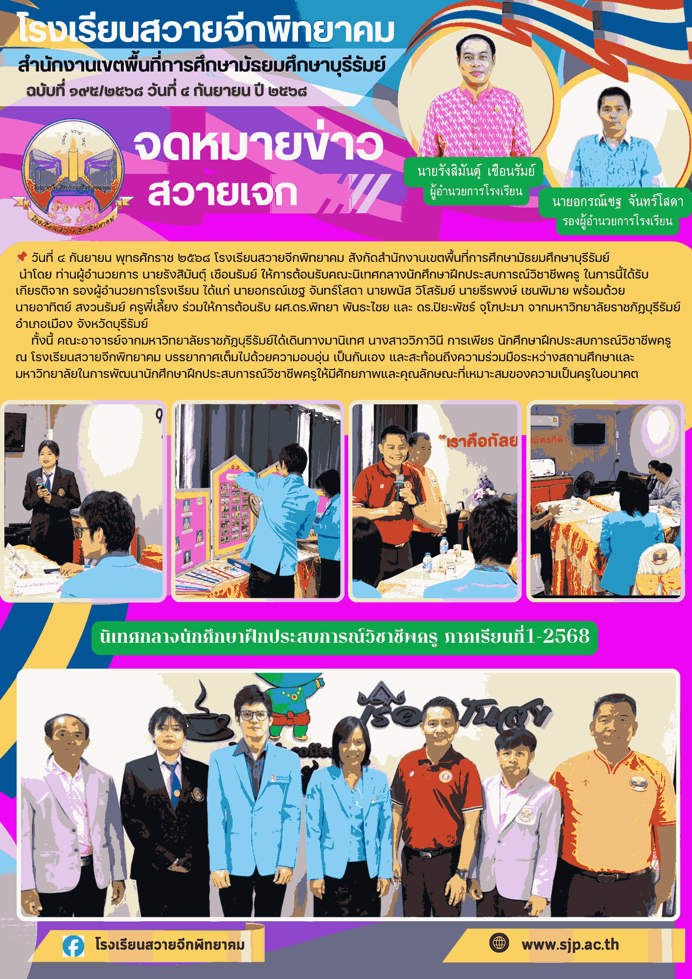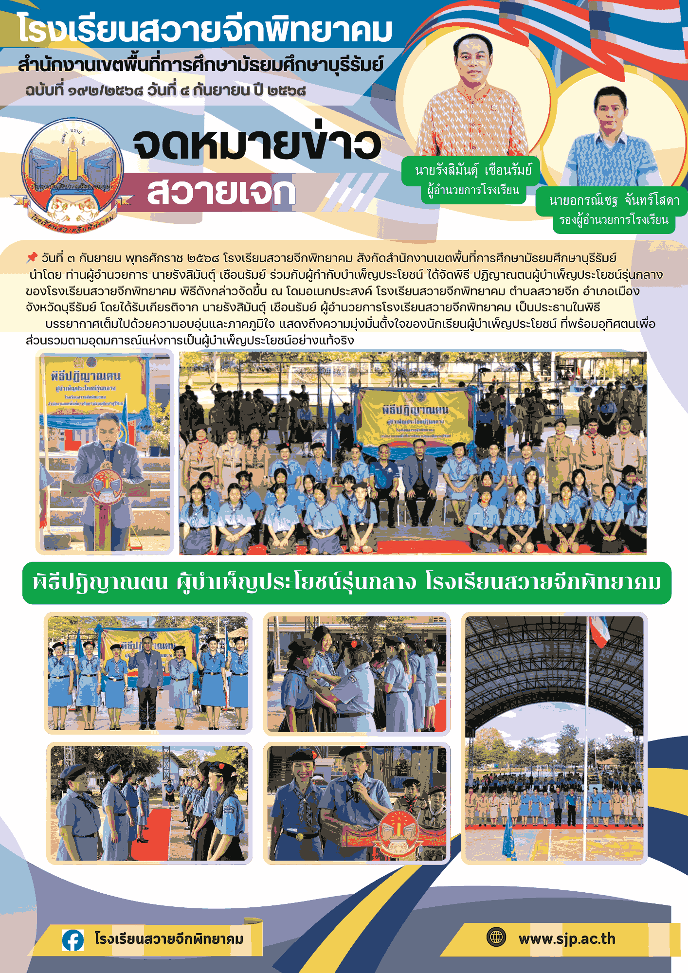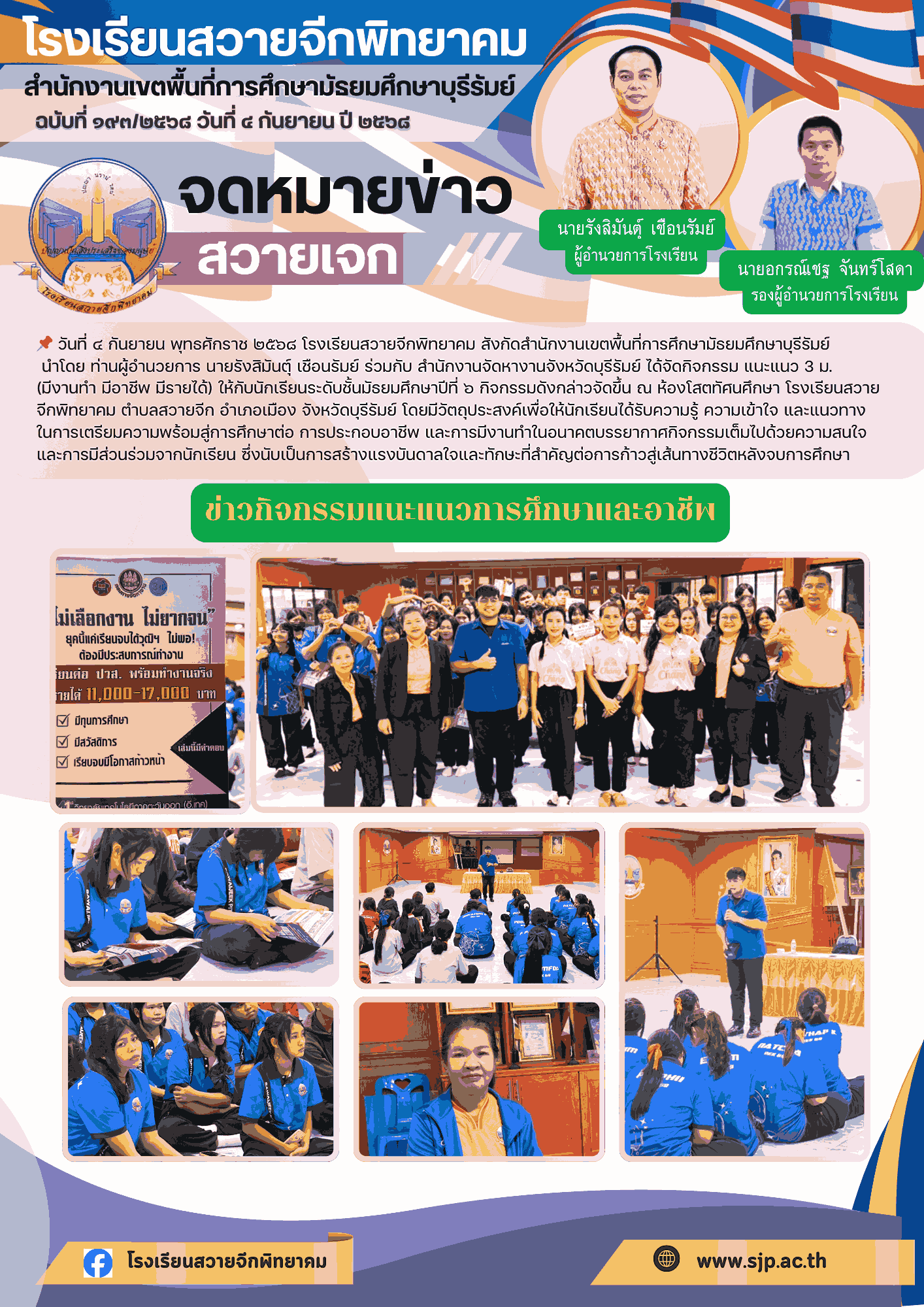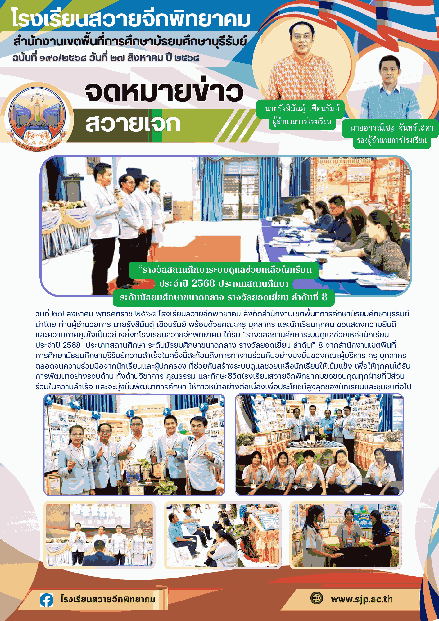 โรงเรียนสวายจีกพิทยาคม ขอแสดงความยินดีกับ ท่านผู้อำนวยการรังสิมันตุ์ เชือนรัมย์ คุณครูอาทิตย์ สงวนรัมย์ คุณครูจรรยา ยิงนารัมย์ในโอกาสที่ได้รับ เกียรติบัตรรางวัลดีเลิศ จากการประกวด “ผู้จัดทำสถานศึกษาที่มีการบริหารจัดการและดำเนินงานระบบงานแนะแนวยอดเยี 03 ก.ค. 68